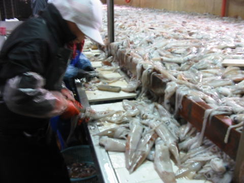 (2) 30,000尾のイカを裁割(腹をひらき、内臓・目玉・トンビを除去)